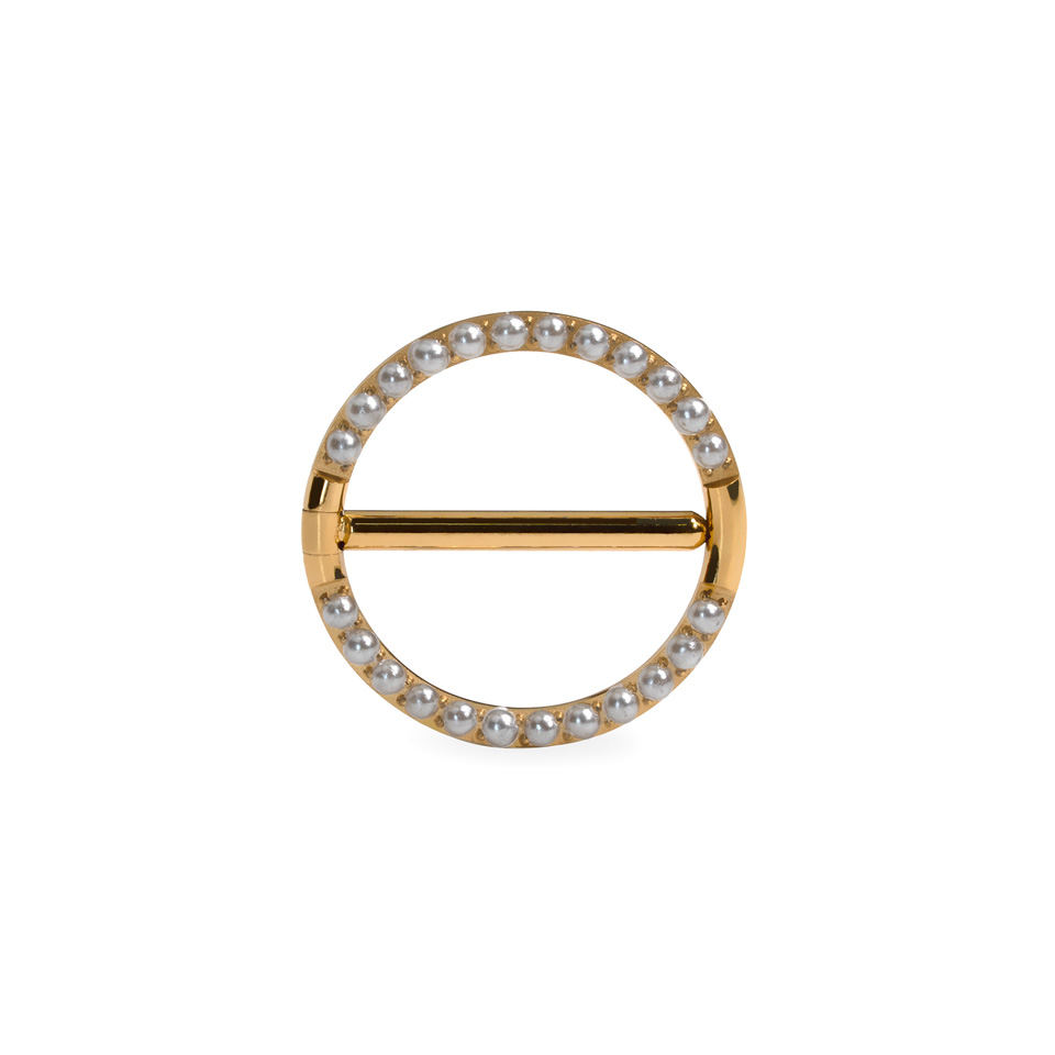 En perlebesat nipple-clicker af titanium, der beviser, at perler ikke kun er til halskæder. En fuld cirkel i farven guld eller sølv besat med tandsatte perler, der indrammer din piercing med glimt og gnister.