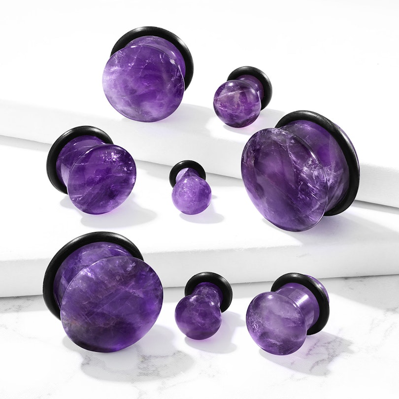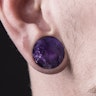 Pluggen du ser på billedet herover er lavet af et organisk materiale - Nærmere betegnet kvarts. Navnet på stenen er ametyst og er utrolig flot i sit varierende udseende. Grundfarven er lille, men farvenuancerne går fra helt lys violet og over i det mørke. I det rette lys kan det endda være muligt at der er helt klare gennemsigtige områder. Som du også kan se på produktbilledet, går der årer igennem smykket. Det er ikke noget der kan mærkes, da de er poleret helt glatte - Men ved stød eller slag, kan de være sårbare i lige præcis de årer, så det gælder om ikke at smide dem på gulvet.