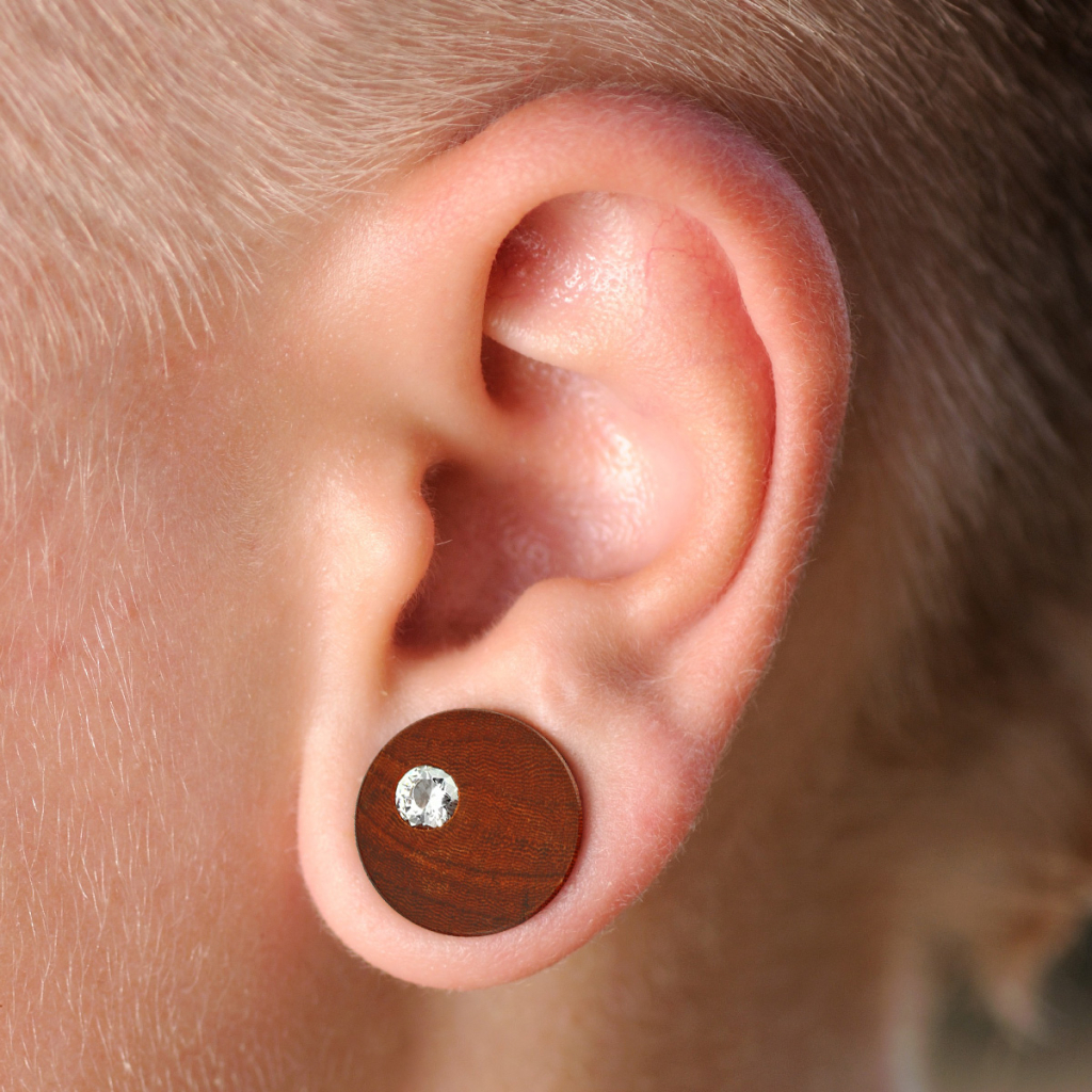Denne plug som fås i seks forskellige størrelser, er pudset op så den har en helt glat overflade samt bløde afrundede kanter. Pluggen er flad og ens på begge sider, på nær den ene klare lille sten der er sat ind som pynt på forsiden. Stenen er nedsænket i træet så den næsten er plan med pluggens overflade og er facetskåret som en diamant så den funkler og glimter fra alle vinkler når lyset rammer den. De flade sider får desuden pluggen til at sidde pænt plan med øreflippen.