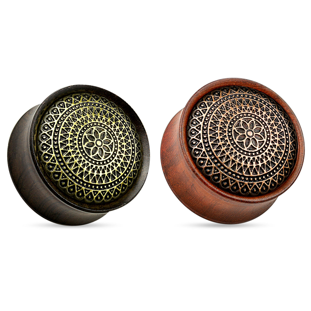 Organiske materialer som træ, har den fordel for dit stretch, at det tillader din hud at ånde mens du bærer smykker. Dette er bedst for din hud og minimerer også ubehagelige lugte. Denne plug har vi på lager i to forskellige trævarianter. Vælg mellem det rødbrune rosentræ eller den mørkere ibenholt. Fronten på pluggen er lavet af messing. På modellen af rosentræ, er messingfronten rødlig i farven, hvor den på den anden model er traditionel messingfarvet. Farven på messingmønsteret står dermed i en dejlig kontrast til det naturlige træ farve. Den gyldne front på den sorte plug giver smykket et antik og værdifuldt look mens den rødlige plug harmonerer med det nærmest kobberfarvede mønster og giver en varm glød.