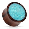 Her er pluggen desuden dekoreret med en hel unik front som består af knust turkis sten. De mange små knuste stykker sten, passer sammen som brikker i et puslespil, hvorefter overfladen er blevet poleret, så den er helt glat. Det er faktisk et helt lille kunstværk i sig selv og en helt ny og kreativ måde at bære sten i sine smykker.