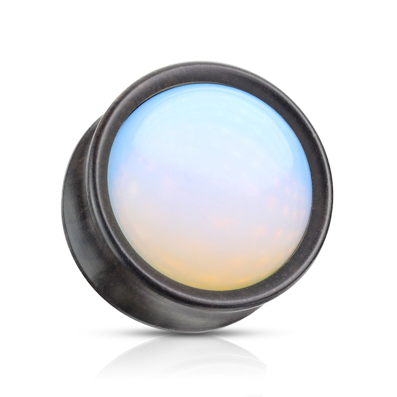 Denne plug er lavet af to organiske materialer, som er henholdsvis træ og glas. Hvorvidt glas er et organisk materiale kan man så diskutere, da det jo er man-made ud af flydende sand. Hvorom alting er, så er pluggen her en fryd for øjet med sin varme brune træfarve og den mælkehvide opalite i fronten. Opalite er, som du også kan se på billedet herover, changerende i farven. Den er primært hvid, men har nuancer af både blå, pink og orange i sig, alt efter hvordan lyser rammer den.