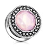 Pluggen, som du er klikket ind på, er blevet belagt med antik sølv på fronten. Heraf kommer den mørke farve, som du kan se på billedet længere oppe. Den mørke farve får virkelig også den pink sten til at træde frem. Rundt om den pink sten sidder der en masse små kugler, som giver smykket noget dybde - så er det heller ikke så kedeligt at se på.