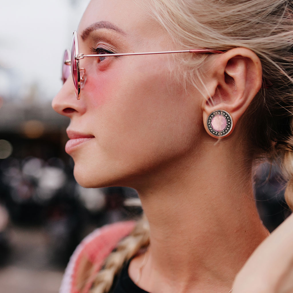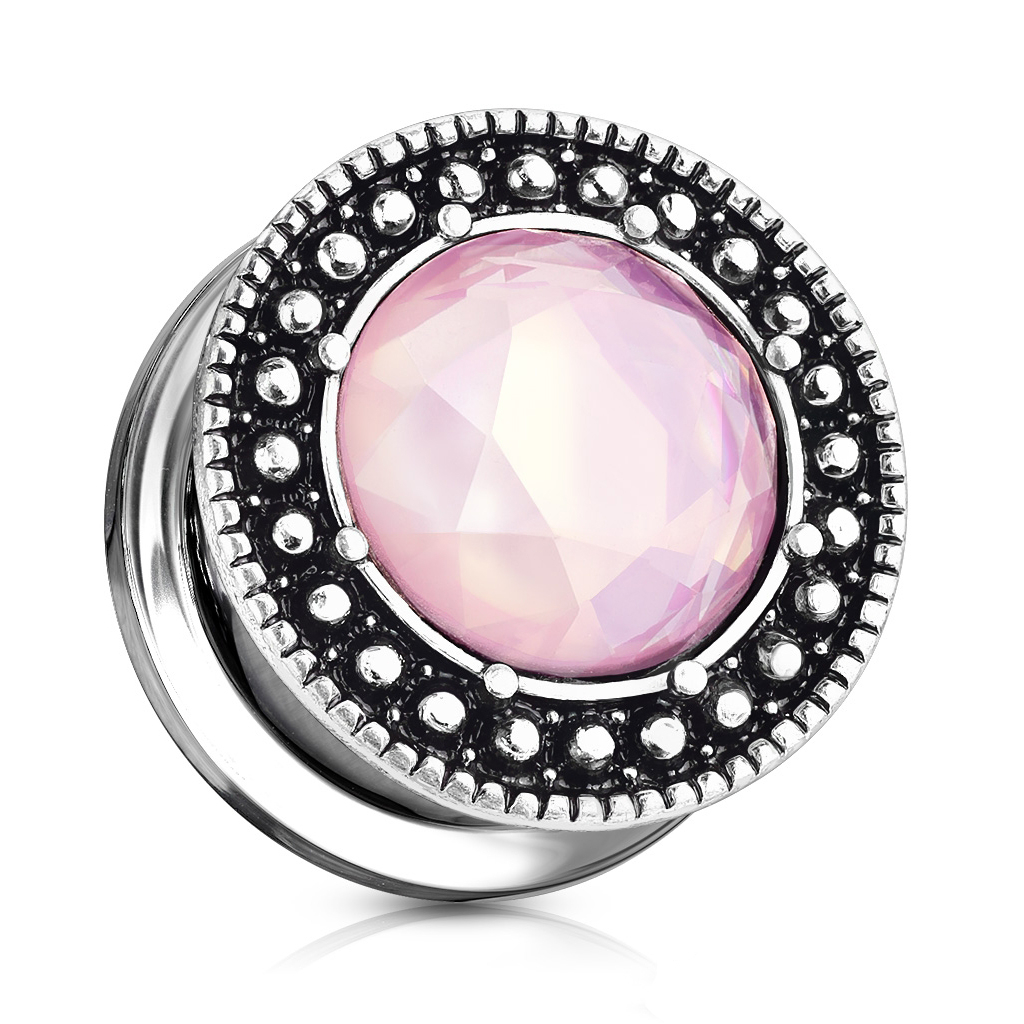 Pluggen, som du er klikket ind på, er blevet belagt med antik sølv på fronten. Heraf kommer den mørke farve, som du kan se på billedet længere oppe. Den mørke farve får virkelig også den pink sten til at træde frem. Rundt om den pink sten sidder der en masse små kugler, som giver smykket noget dybde - så er det heller ikke så kedeligt at se på.