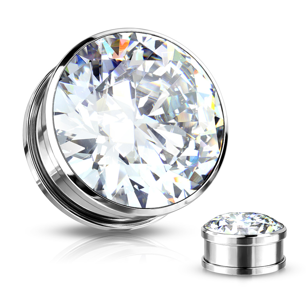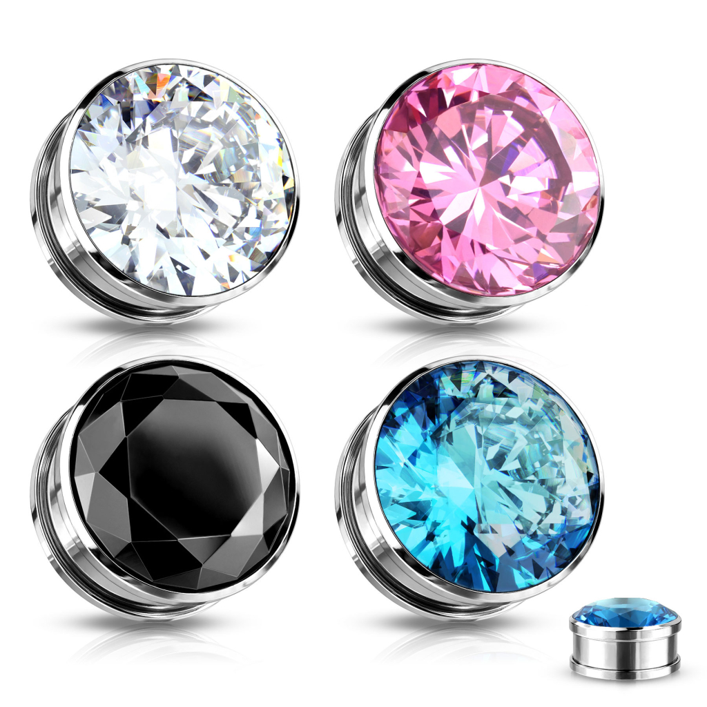 Denne plug er lavet af kirurgisk stål og fås i 4 farver og mange forskellige størrelser alt afhængig af hvor langt du er med dit stretch. Foran sidder der en skinnende diamantformet sten i en flot farve, som ses tydeligt helt ned i den mindste størrelse plug. Denne plug lukkes bagpå øret med et skruegevind, som gør den rigtig nem at sætte i. Derudover får du en plug der er let i sig selv at have siddende.