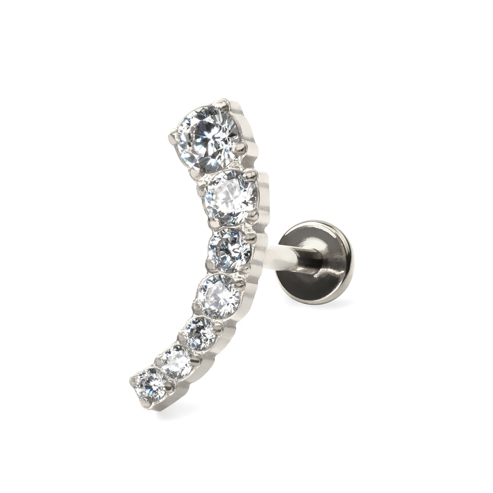 Denne iøjefaldende push-in-labret af titanium med en kurvet top og 7 klare sten fås i 2 farver, guld og sølv, og 2 længder, 6 mm og 8 mm. Trådtykkelsen er altid 1,2 mm.