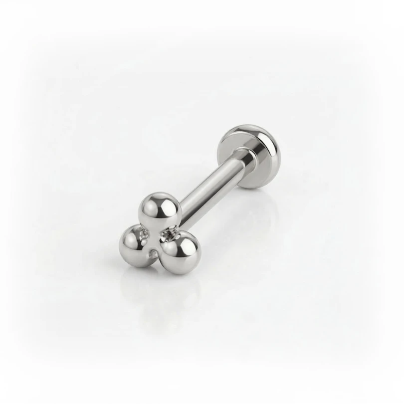 Push-in labret af titanium med tre små kugler i trekantsformation