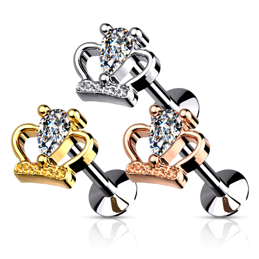 Denne labret har i fronten en flot krone. Kronen findes i flere farver. Fælles for alle varianter er længden, tykkelsen og stenfarven. Kronen har nemlig midt på, en flot omvendt dråbeformet klar sten. Bag på kronen sidder en lille stift, som skubbes ned i staven. Der er altså ingen gevind der skal skrues fast. Hvis man synes at kronen er for let at tage ud, kan man give stiften et lille buk, så den sidder bedre i spænd nede i selve staven.