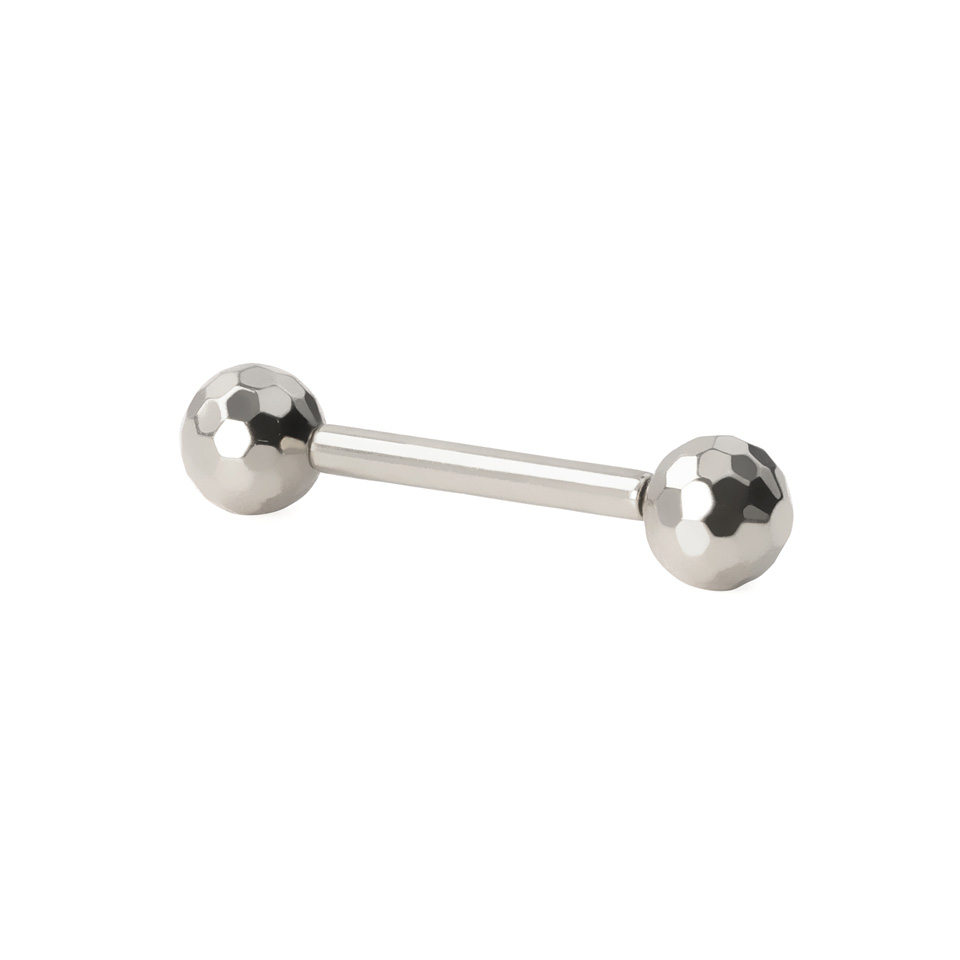 Denne titaniumstav har en kugle i hver ende med mange facetter, der får dem til at ligne diskokugler. Smykket er uden gevind og har i stedet en push-in-lås, som gør det let som en leg at tage på. Du skal bare skubbe kuglerne ind i staven for at sætte dem fast, så du slipper for besværlige skruebevægelser.