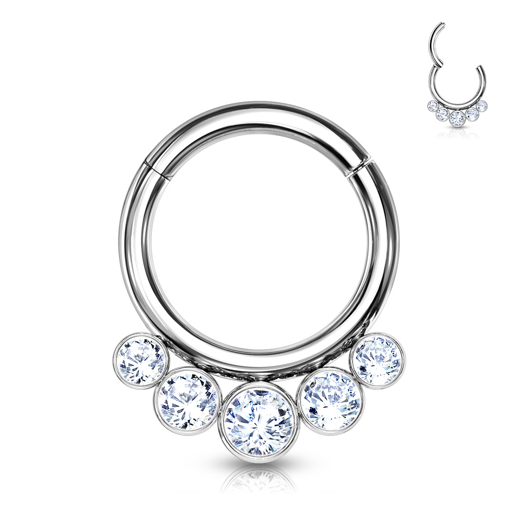 Ringen her er lavet af titanium, som er et af de bedste materialer, du kan byde din piercing. Det er også derfor, det anvendes til førstegangssmykker, når du skal pierces. Ringen måler 1,2 mm i tykkelsen og kan vælges i henholdsvis 8 og 10 mm i diameter. Uanset hvilken diameter du vælger, vil der i bunden af ringen være fem sten. Den midterste er den største, og stenene bliver mindre mod enderne som i en buet klase.