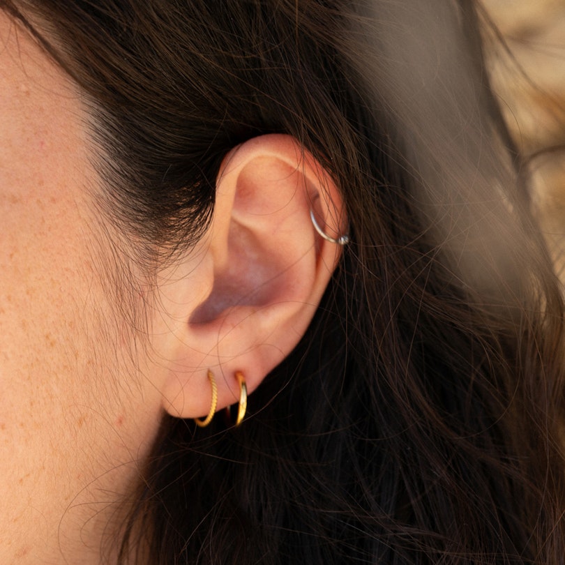 Hvordan skal man så åbne ringen, vil mange spørge? Det er let til. Ringen åbnes ved at vride den let, så den kommer til at ligne en twisterring. Derefter sættes smykket på plads i piercinghullet, og ringen vrides tilbage, så enden på ringen kommer ind i den lille fordybning i kuglen. Bemærk her, at jo tykkere tråd og jo mindre diameter du vælger, jo sværere vil ringen være at twiste. Her kan med stor fordel anvendes en piercingtang til formålet.