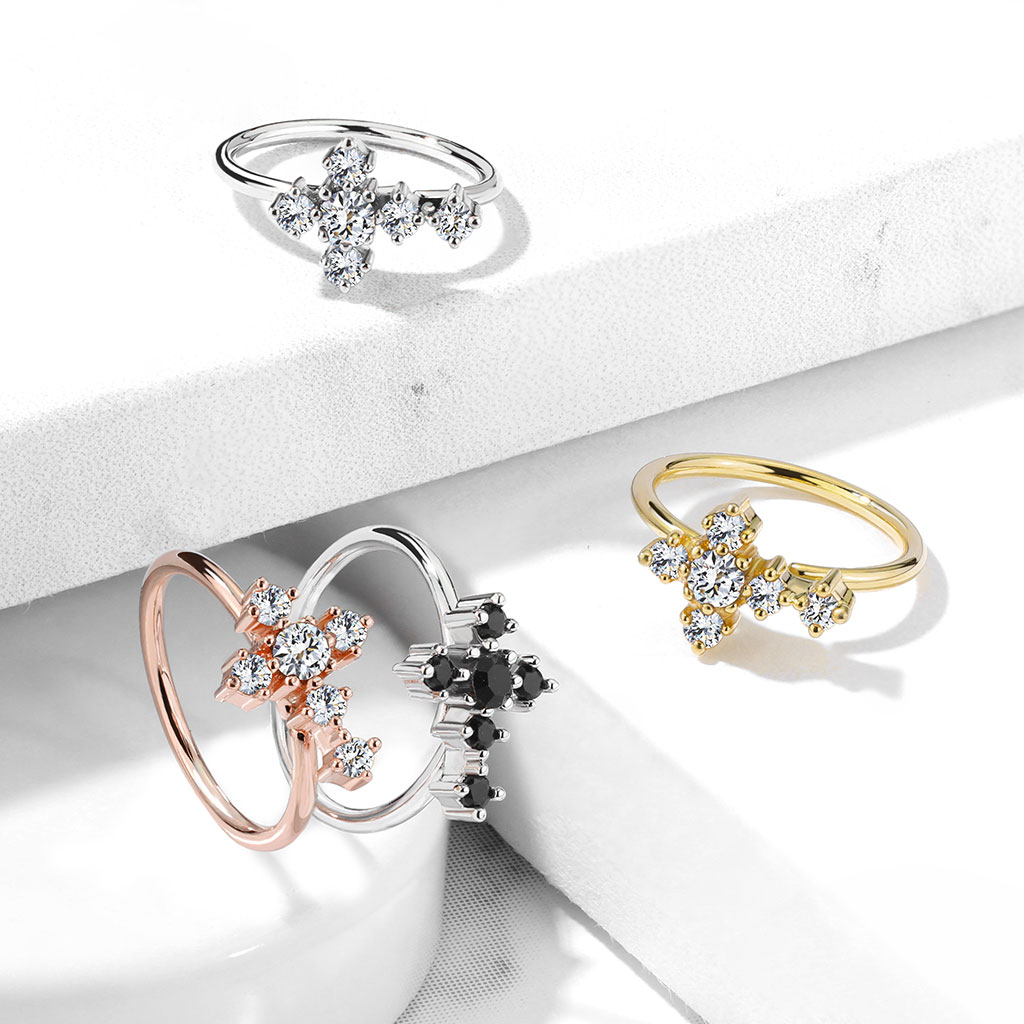 Smykket er lavet af messing og måler 0.8 mm. i trådtykkelse, samt 8 mm. i diameter. Den er blevet belagt med Platinum, hvis du vælger den blanke udgave, eller 14 karat guld, hvis du vælger en af de to guld modeller. Som du nok allerede har lagt mærke til, så sidder der også et flot kors på fronten af smykket. Dette kors er blevet besat med seks små sten - disse sten kan du vælge farven på. Du kan blandt andet få ringen med klare sten på korset, eller med sorte sten på korset.