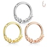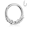 Laurbærkranse var forbeholdt sejrherrerne ved Delfi-legene fra oldtidens Grækenland. Men nu kan du i din piercing også få en laurbærkrans. Den er her på en hængslet ring af kirurgisk stål, hvor bladene udspringer fra ringens nederste midterste del og går ud til hver sin side. De fortsætter ikke hele vejen rundt på ringen, da den ellers vil være noget nær umulig at bære.