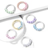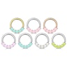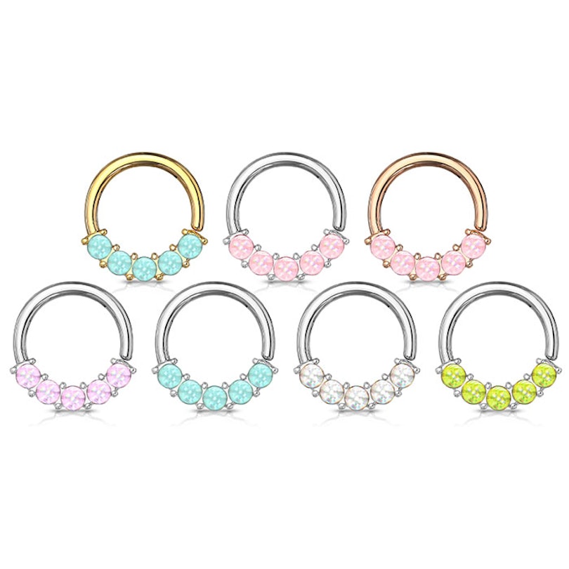 Smykket er lavet af kirurgisk stål og belagt med forskellige farver. Du kan derfor blandt andet få ringen i en feminin rosaguld, eller andre farver der måske tiltaler dig mere. Du kan se hele udvalget i kassen lidt længere oppe på siden. Ringen er lavet til at kunne vrides frem og tilbage - derfor er den også utroligt nem at bruge. Det er dog ikke kun farven på ringen som du kan vælge. Du kan også vælge mellem mange forskellige stenfarver på de fem reflekterende sten, der sidder på fronten af smykket. Farverne finder du også i kassen lidt længere oppe på siden. Stenene er lavet af en resin, der får stenene til at reflektere det lys der rammer dem. Så her får du et meget skinnende smykke, der helt sikkert vil være meget iøjnefaldende uanset, hvor det sidder henne.