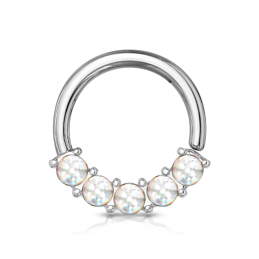 Smykket er lavet af kirurgisk stål og belagt med forskellige farver. Du kan derfor blandt andet få ringen i en feminin rosaguld, eller andre farver der måske tiltaler dig mere. Du kan se hele udvalget i kassen lidt længere oppe på siden. Ringen er lavet til at kunne vrides frem og tilbage - derfor er den også utroligt nem at bruge. Det er dog ikke kun farven på ringen som du kan vælge. Du kan også vælge mellem mange forskellige stenfarver på de fem reflekterende sten, der sidder på fronten af smykket. Farverne finder du også i kassen lidt længere oppe på siden. Stenene er lavet af en resin, der får stenene til at reflektere det lys der rammer dem. Så her får du et meget skinnende smykke, der helt sikkert vil være meget iøjnefaldende uanset, hvor det sidder henne.