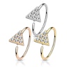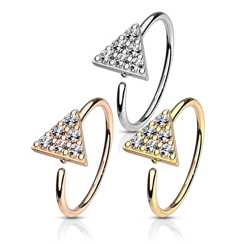 På fronten sidder der en fin lille trekant og fungerer som dekoration på ringen. Trekanten er blevet udstyret med en masse bittesmå klare sten, der sidder og funkler på den. Trekanten er også blevet belagt med de forskellige belægninger, så den matcher den ring, som den sidder på.