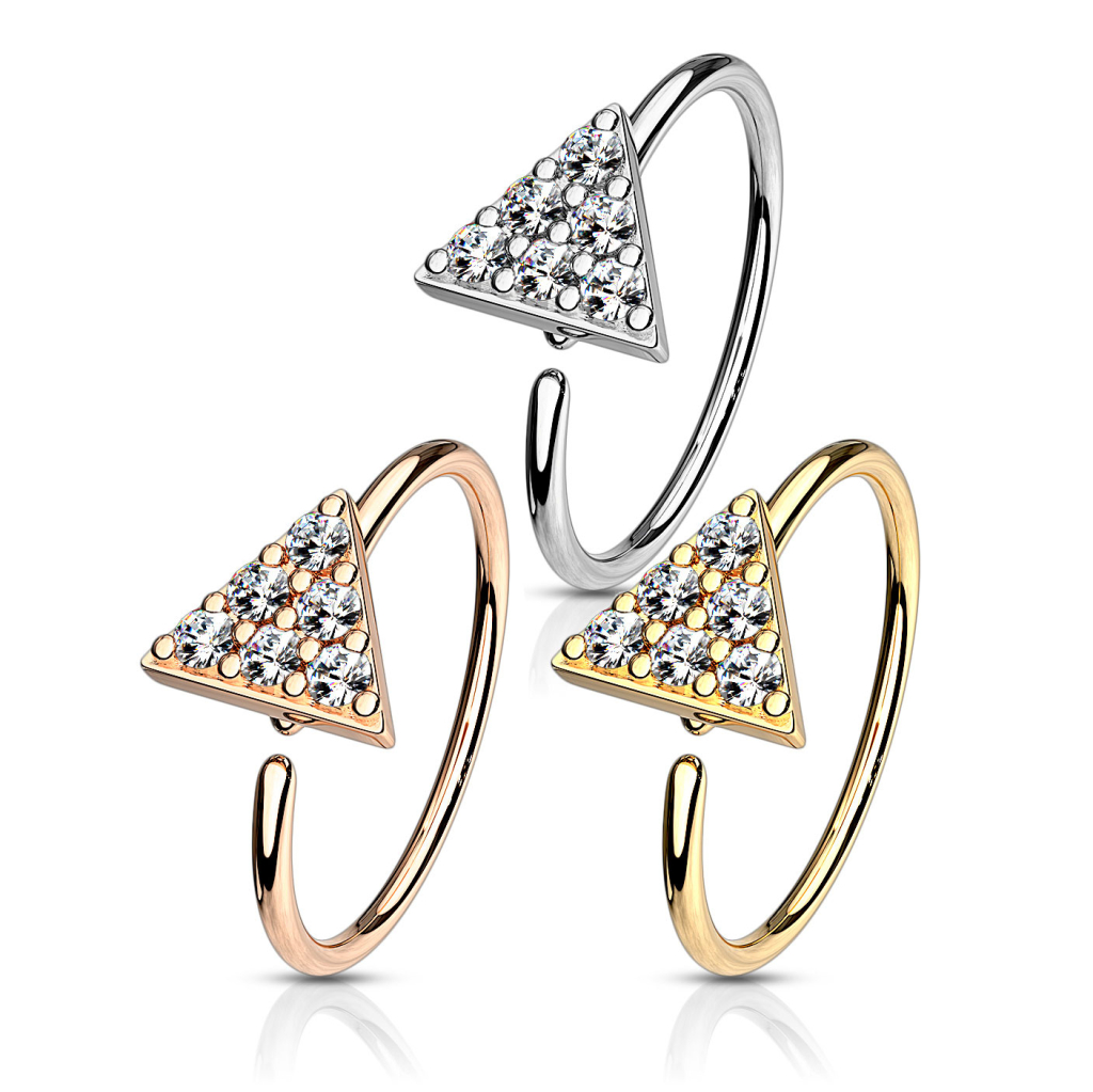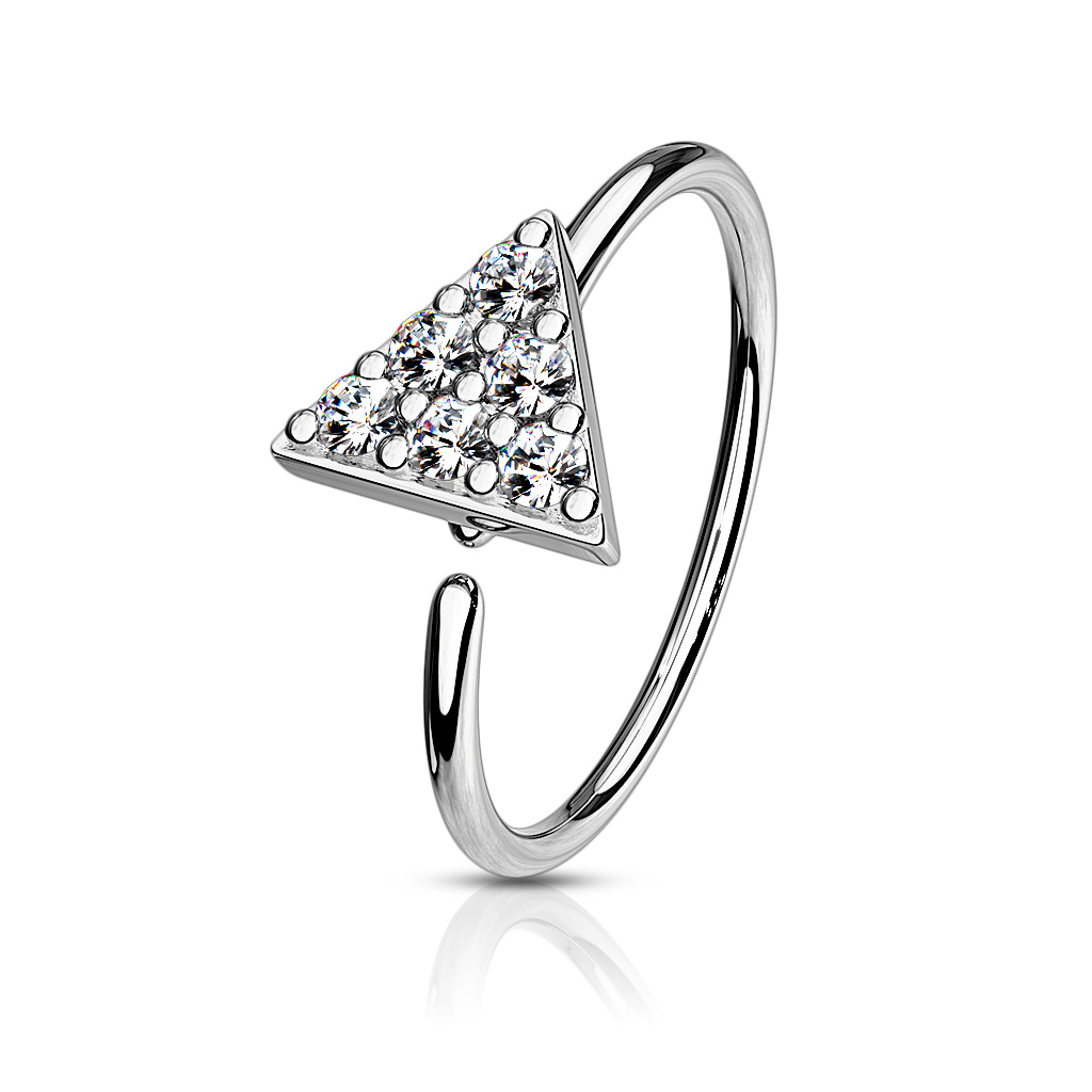 På fronten sidder der en fin lille trekant og fungerer som dekoration på ringen. Trekanten er blevet udstyret med en masse bittesmå klare sten, der sidder og funkler på den. Trekanten er også blevet belagt med de forskellige belægninger, så den matcher den ring, som den sidder på.