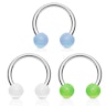 Super cool smykkesæt med tre hestesko i hver sin selvlysende farve. Selve hesteskoen er lavet af ren kirurgisk stål mens kuglerne er lavet af akryl, som lyser i mørke, hvis de bliver opladet under en lampe. Du får hele tre hestesko i denne pakke, i farverne blå, grøn og hvid.