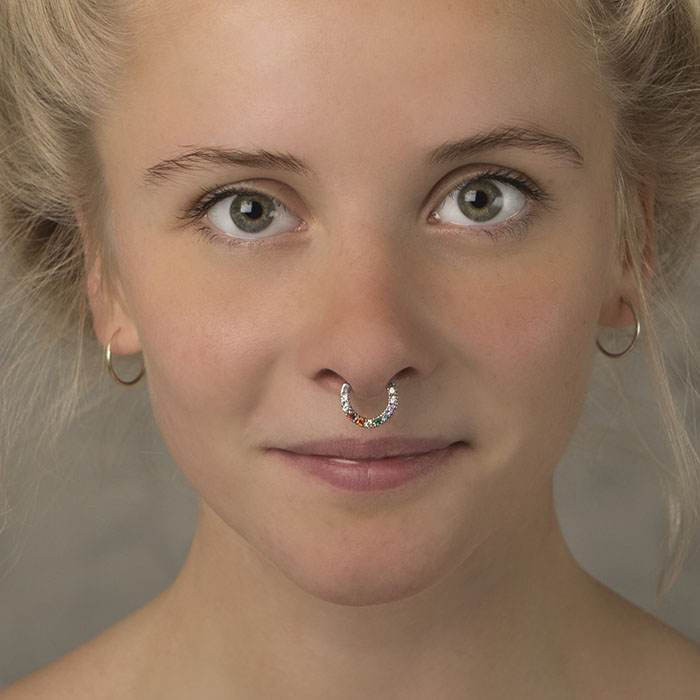 Hvis du har sat næsen op efter at få dig en afsindig smuk og elegant septumpiercing, så har vi det helt perfekte smykke til dig lige her. Denne vidunderlige septumpiercing er både klassisk og overdådig i sit design på én og samme tid. Den cirkelrunde halvbue er dekoreret med hele 10 vidunderlige sten der nærmest glitrer om kap med hinanden.