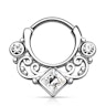 Der er tale om en septumclicker som åbnes og lukkes super nemt med et enkelt lille klik. Den lille stav som klikkes op og ned i selve septumringen når smykkes skal af og på, har en let buet form, frem for blot at være en helt lige stav. Det har den smarte effekt at selve septumringen, ikke kommer til at sidde alt for tæt på næsen. Den flotte halvbue med sten og snoninger, lægger sig altså pænt under næsen.