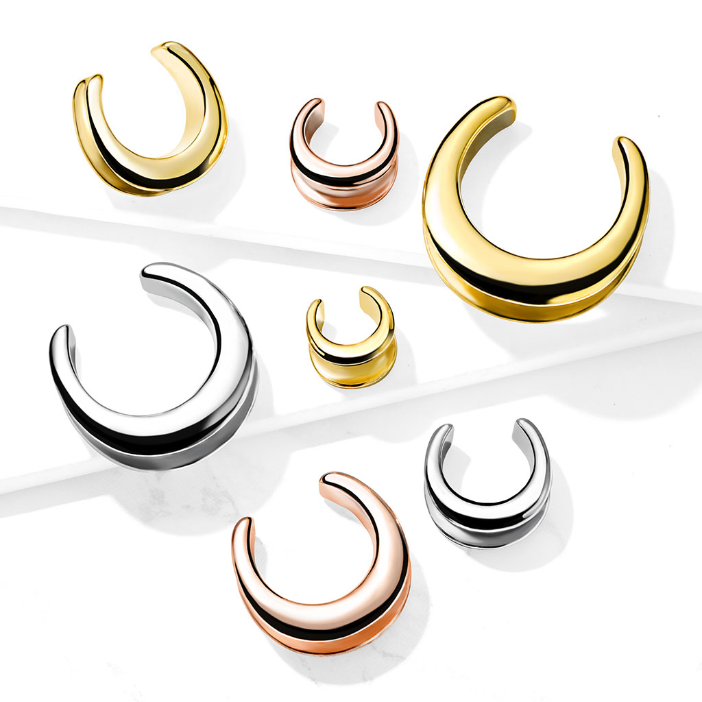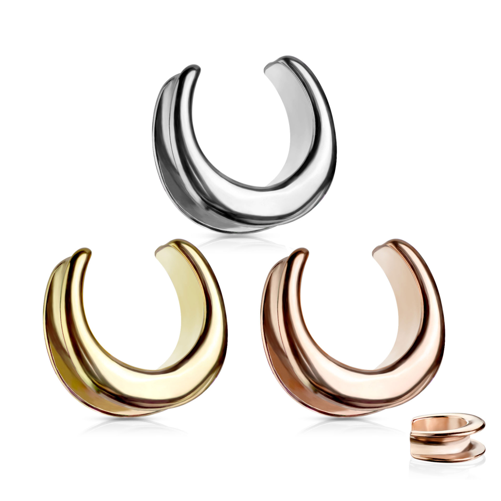 Smykket du ser her er lidt svær at kategorisere. Navnet er en saddle spreader og det er hverken en tunnel, en plug eller en hanger. Og det er slet ikke en taper. Det nærmeste er måske en tunnel, da man trods alt kan se igennem smykket. Smykket er dog åben i toppen, hvilket også har den fordel at du kan benytte smykket selvom dit hul i øret er større end den diameter smykket har. Smykkets kanter krænger nedad, hvilket gør at de omkranser kanten på dit hul. Det falder dermed ikke bare ud, selvom smykket er mindre end dit hul.
