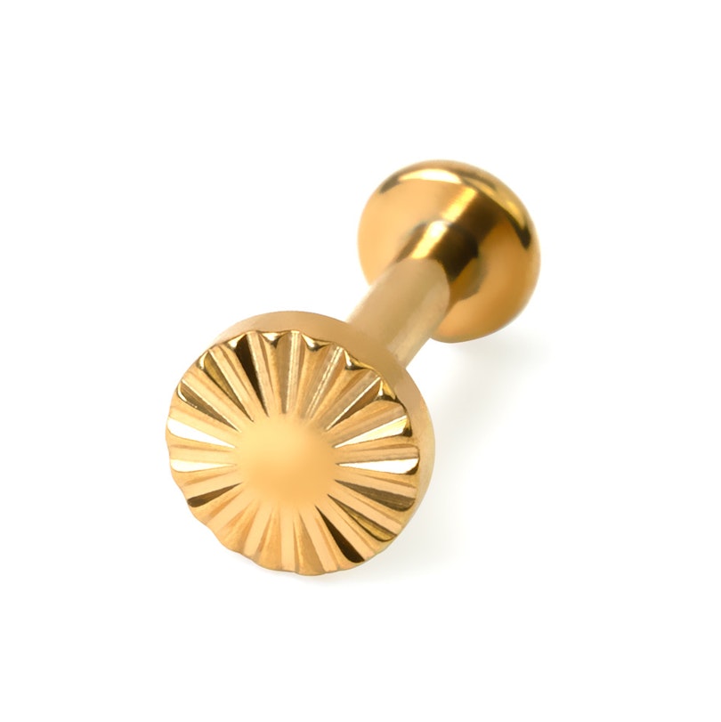 Denne stilfulde labret har en cirkulær top med facetter, hvis linjer stråler ud fra midten. Den har indvendigt gevind og en flad bagside, som gør den behagelig at have på og nem at sætte sikkert i din piercing. Labretten er lavet af titanium og derfor allergivenlig og velegnet til følsom hud. Du kan vælge mellem farverne guld og sølv alt efter, hvad der matcher din stil. Med en tykkelse på 1,2 mm og et udvalg af længder passer labretten i de fleste øre- og læbepiercinger.