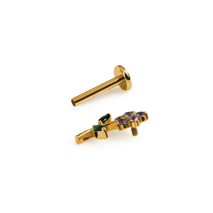 Det indvendige gevind gør det irritationsfrit at sætte i og sikkert at have på, at du ikke mister smykket i løbet af dagen. Fås i farven guld eller sølv og virker godt til conch, helix eller øreflip. Et lille blomsterglimt, der altid passer ind.