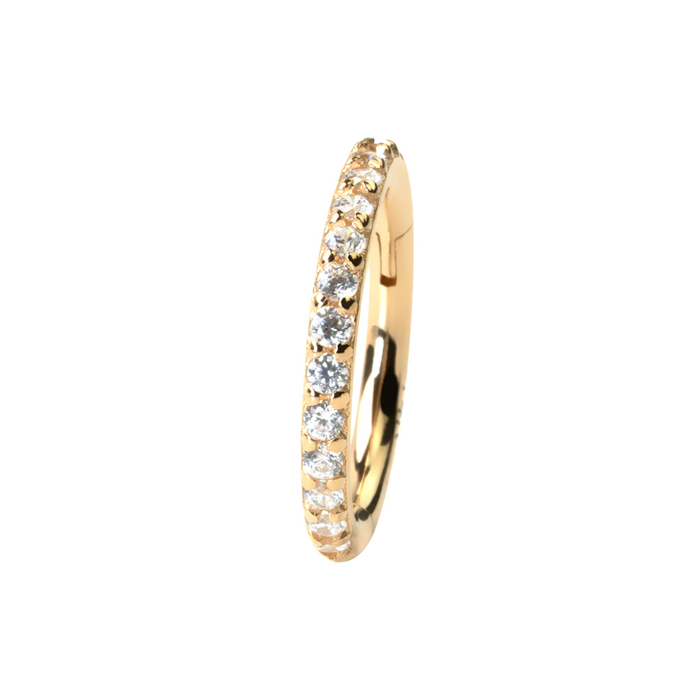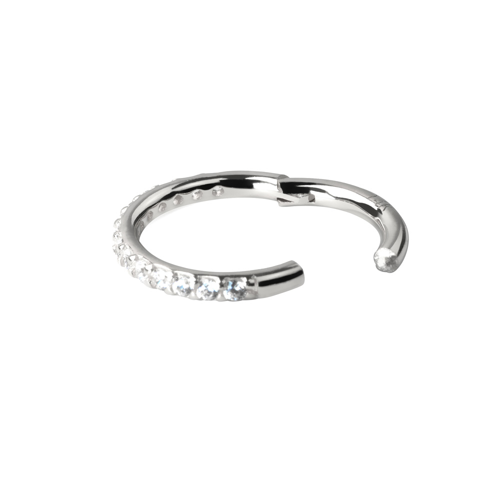 Hænglser på ringe er fantastiske. De er utroligt nemme at åbne og lukke, samtidig med, at man ikke skal bekymre som om ens smykke falder ud. Hængslen sidder på en ring, der er lavet af 14 karat guld, hvor du kan få flere udgaver - blandt andet den elegante 14 karat hvidguld. På ydersiden af den synlige del af ringen sidder der en lang række små klare sten og pynter smykket.