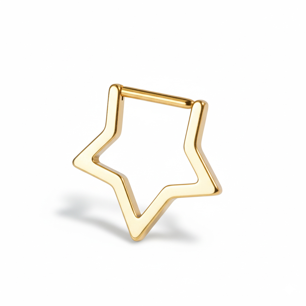 Stjerneformet clicker-ring af titanium, der er perfekt til mange forskellige piercinger. Eksempelvis vil den se fantastisk ud i en septum-, helix-, øreflip- eller rook-piercing. Smykket er lavet af holdbart titanium, vandfast, blidt ved følsom hud og lavet til at holde. Hængselåbningen gør det enkelt at sætte i din piercing. Dette smykke er faktisk hult, hvilket muliggør et heftigere look uden at øge vægten, så det stadig er behageligt at have på.