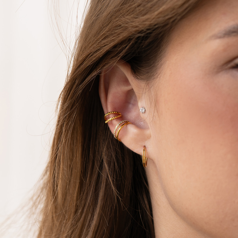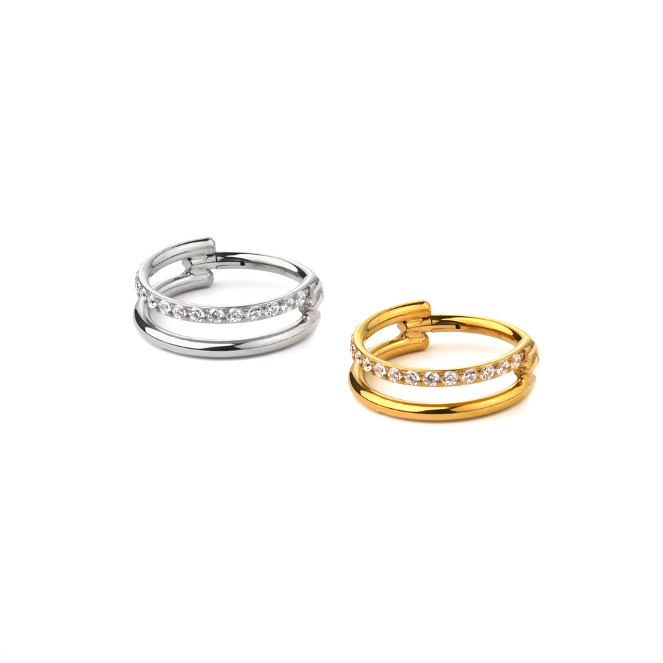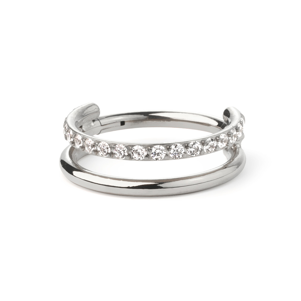 Dette usædvanlige smykke ser ud som to ringe, en med en række af bittesmå sten og en uden. De to ringe er forbundet ved en enkelt bue, som går igennem din piercing. Ringen er lavet af titanium og er derfor allergivenlig og virkelig holdbar. Fås i forskellige diametre og farverne guld eller sølv. En smuk ring, der passer til flere ørepiercinger og føjer glamour til dit ørearrangement, uanset hvordan du vælger at have den på.