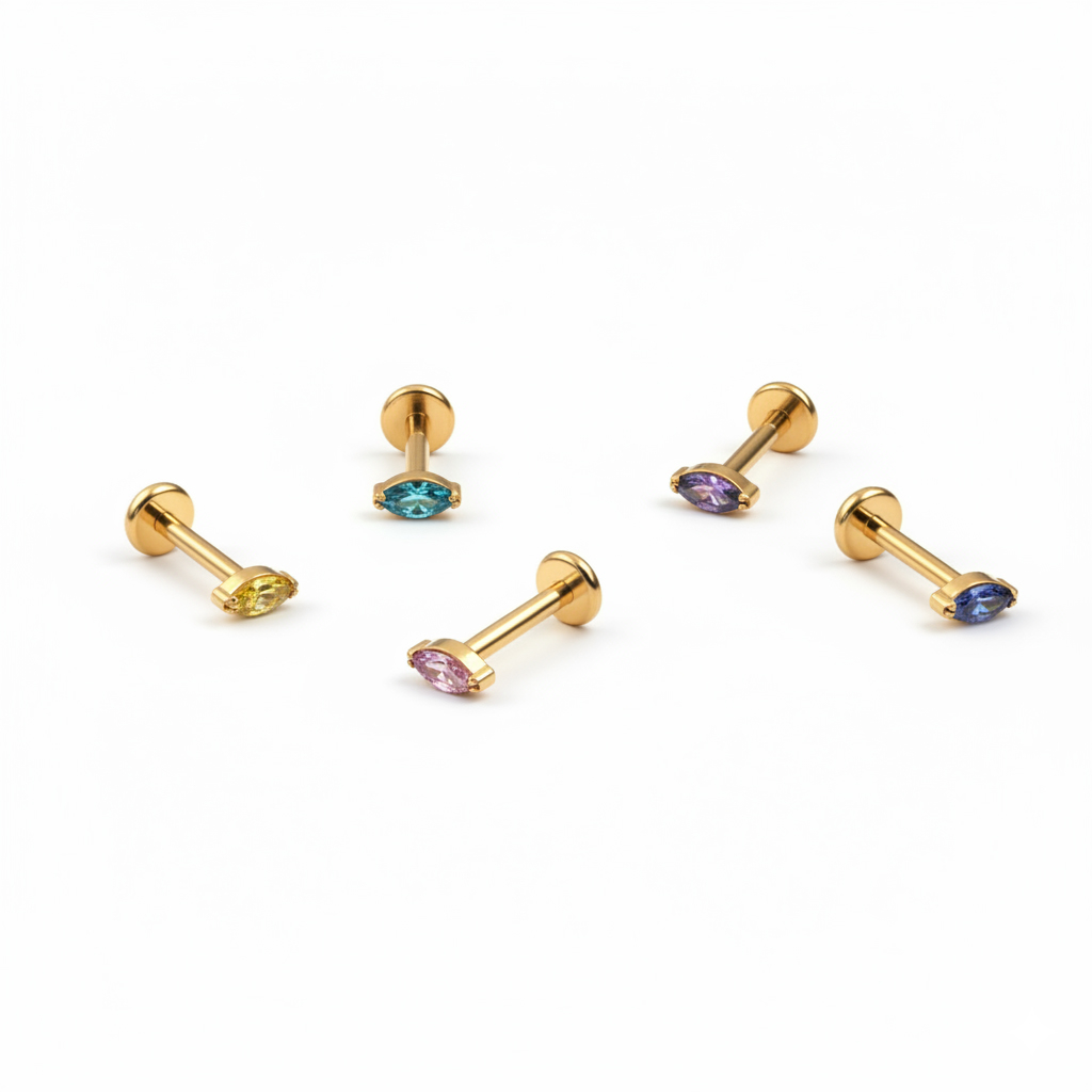 Den marquise-skårne sten er en flot detalje, der virker i enhver øre-stack. Smykket er lavet af ASTM F136 titanium, der er allergivenligt, vandfast og kan holde hele livet med den rette pleje. Det indvendige gevind holder det irritationsfrit og sikkert, så når det først sidder i, behøver du ikke tænke på mere.