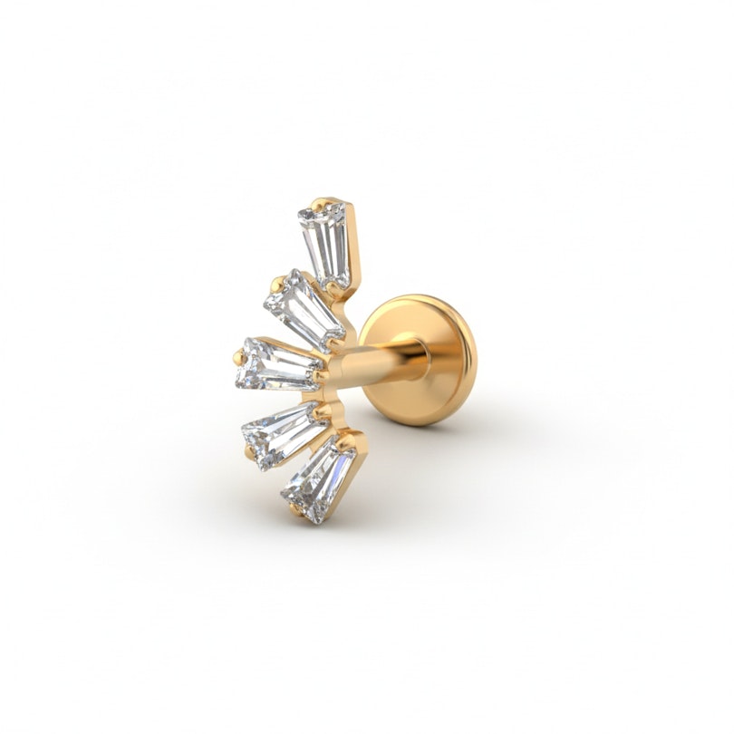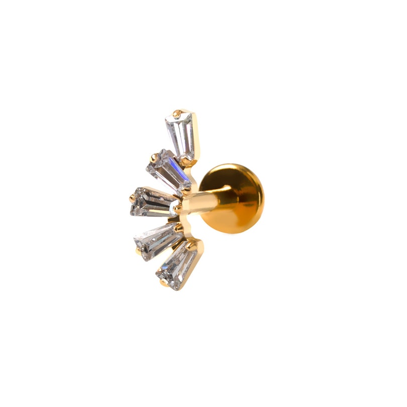 En titaniumlabret med baguette-skårne sten, der er bygget til de øjeblikke, der kræver struktur. De baguette-skårne sten står i en ren og skarp linje, der giver dit øre et fint look, der udtrykker balance.