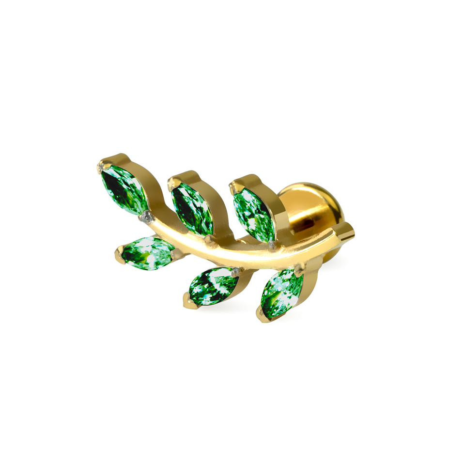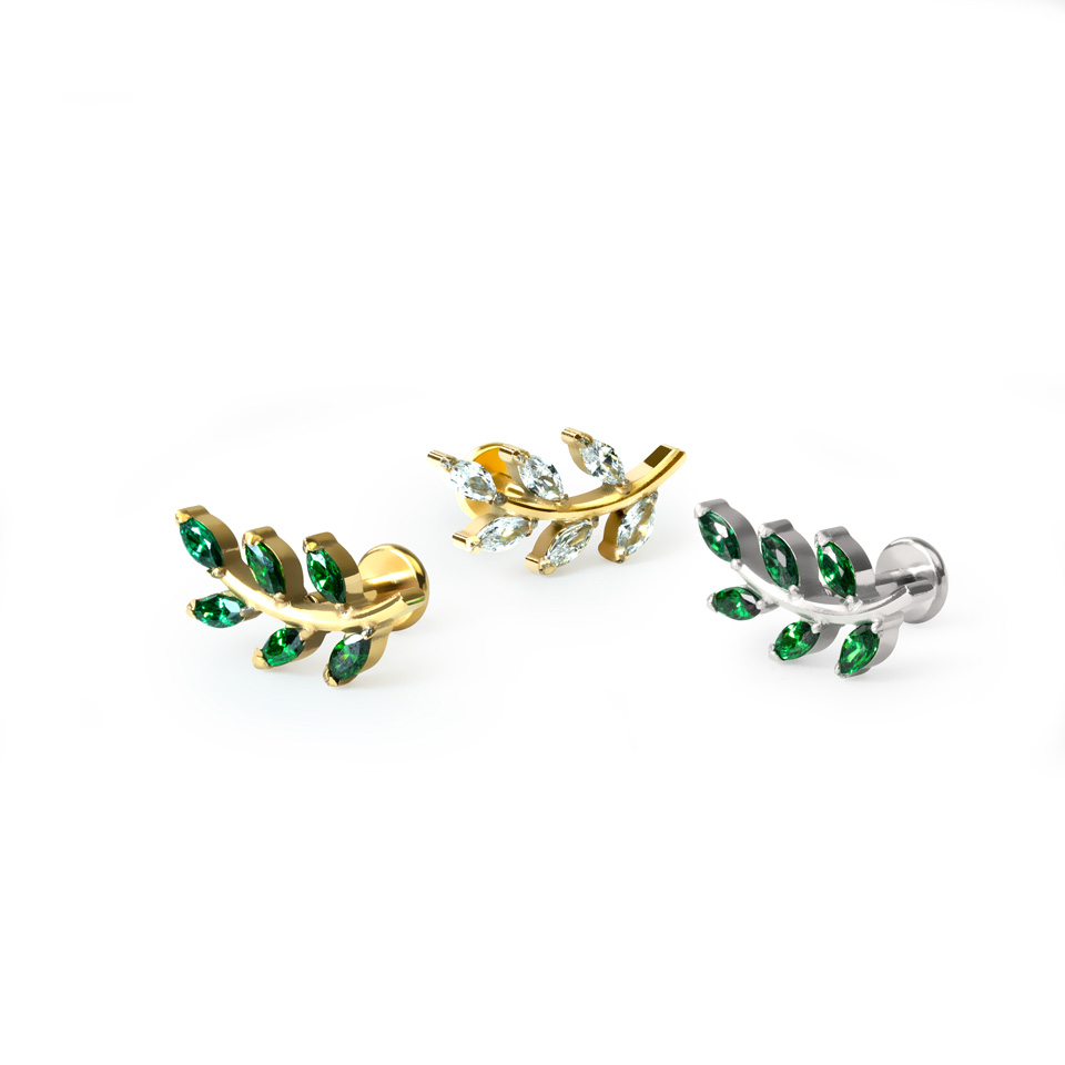 Smuk, førsteklasses labret i form af et blad prydet med 6 fine, marquise-skårne sten. Fås med friske grønne sten eller klassiske klare sten samt farverne guld eller sølv, så denne stilfulde labret passer helt sikkert til dine andre øresmykker.