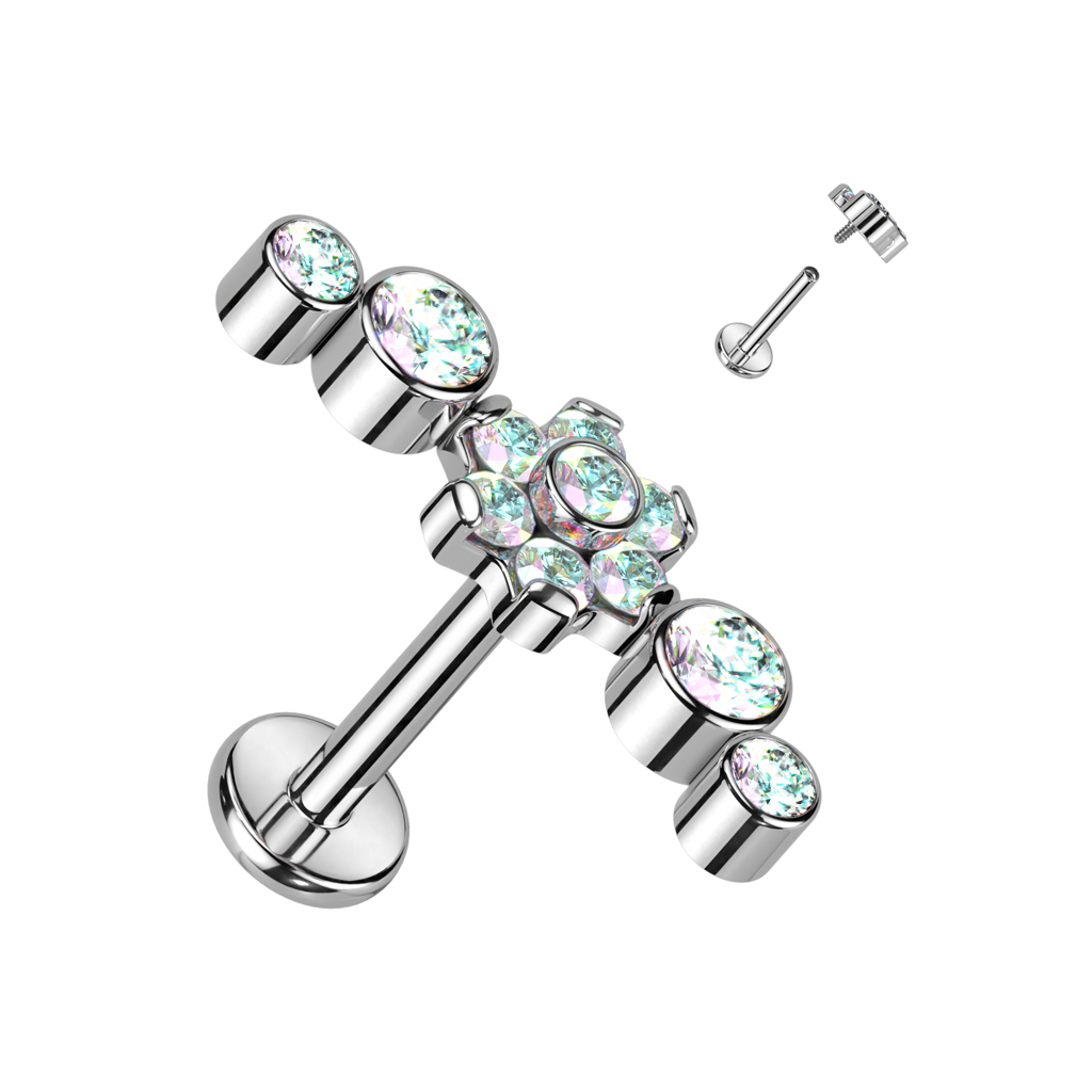 Denne labret er lavet af titanium, et af de mest holdbare og anbefalede materialer til piercingsmykker. Den har indvendigt gevind, dvs. toppen skrues ind i staven, så du ikke skraber huden, når du sætter smykket i din piercing.