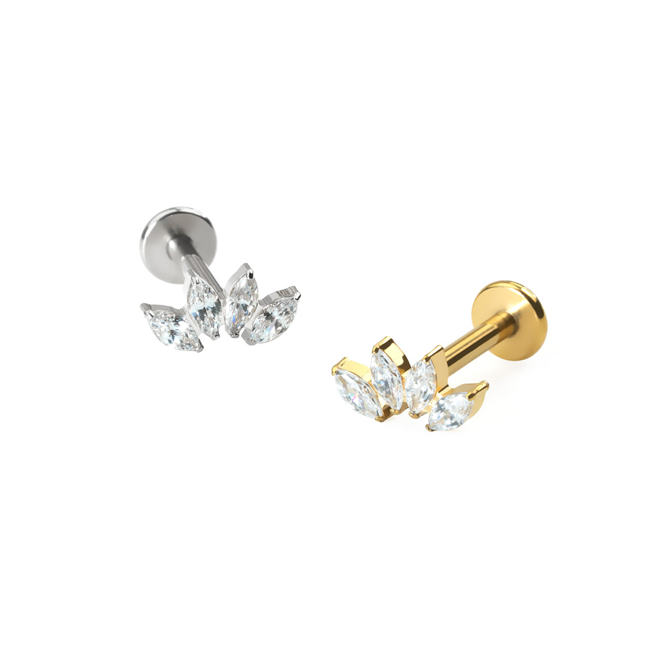En fin labret med 4 marquise-skårne CZ-sten arrangeret i en bue. Ideel til en række forskellige ørepiercinger, især conch og flat. Smykket har indvendigt gevind, hvilket betyder, at du tager det på ved ganske enkelt at føre den glatte stav igennem din piercing og skrue toppen på plads. Det er lavet af titanium, så smykket er behageligt at have på selv for dem med følsom hud.