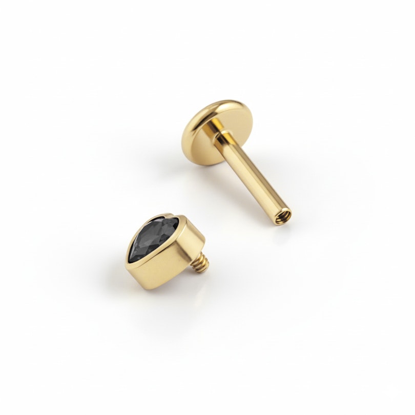 Den er lavet af titanium, så den er allergivenlig, vandfast og robust til hverdagsbrug. Det indvendige gevind gør indsættelsen nem og holder pasformen sikker, så den bliver, hvor den skal. Fuldendt med en flad bagside, så den er behagelig at have på hele dagen.