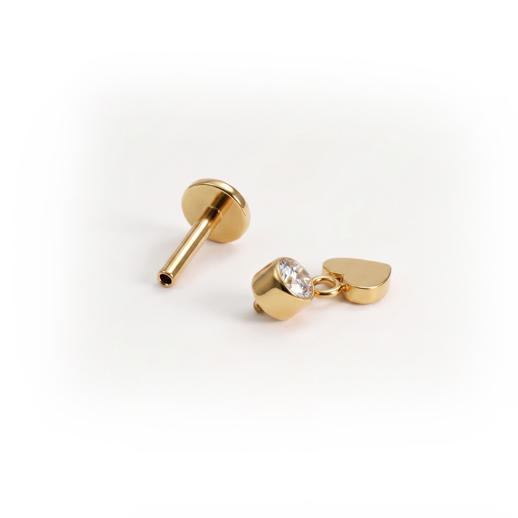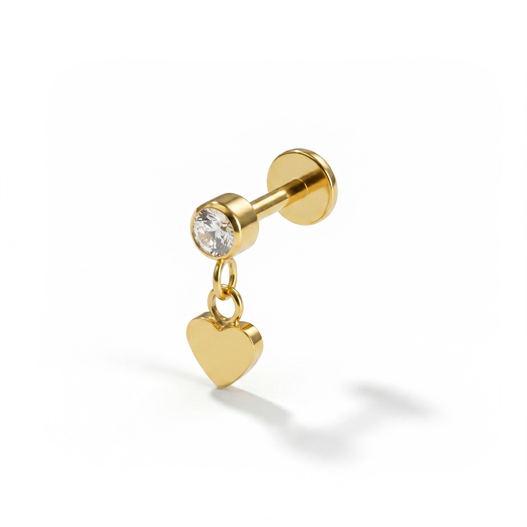 Denne titaniumlabret med hjertevedhæng er enkel ved første øjekast, men tilføjer så en lille detalje, der løfter hele looket. En indfattet sten sidder øverst, mens et hjerteformet vedhæng hænger lige under med bløde bevægelser. Det er den slags smykke, der er nemt at style for sig selv eller sammen med andre piercingsmykker. Fås i farverne guld og sølv.
