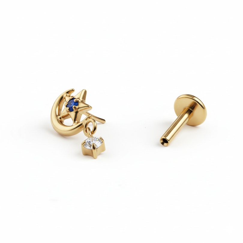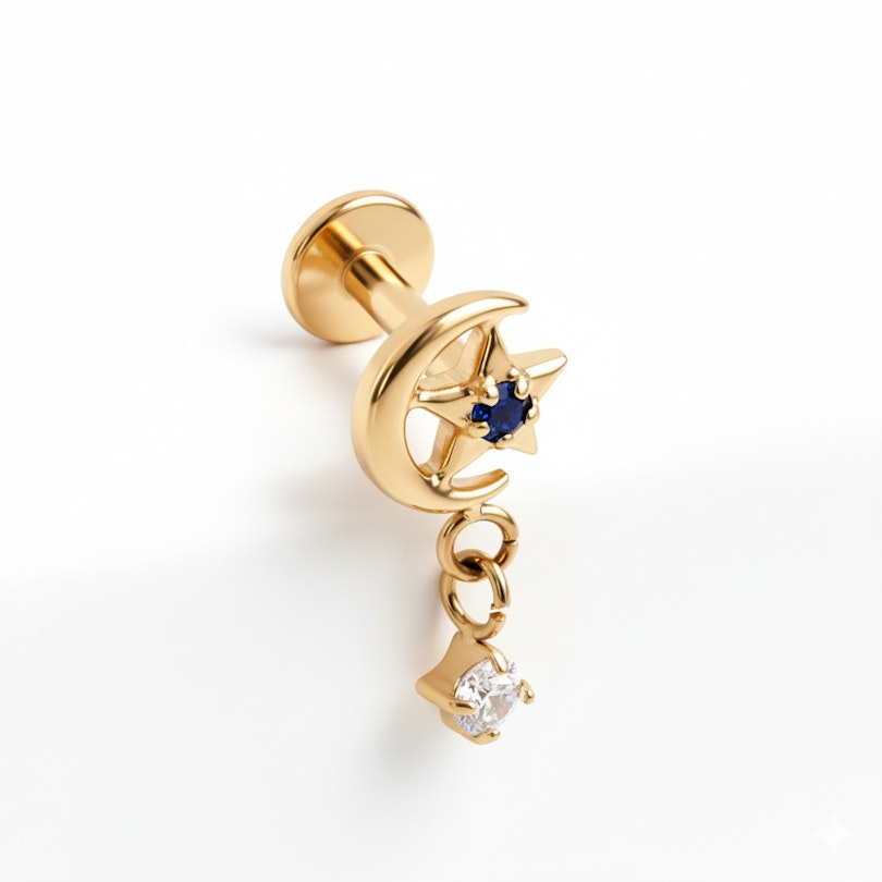 En titaniumlabret med måne, stjerne og vedhæng, der giver dit look lidt bevægelse. En lille måne og stjerne pryder forsiden, og et fint vedhæng svajer let, når du bevæger dig. Pyntet uden at være for meget og perfekt til, når du vil være lidt mere udtryksfuld. Fås i guld- og sølvfarve.
