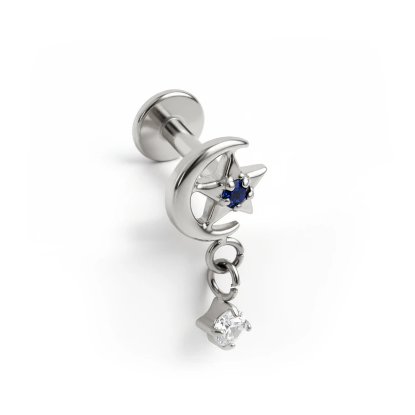 En titaniumlabret med måne, stjerne og vedhæng, der giver dit look lidt bevægelse. En lille måne og stjerne pryder forsiden, og et fint vedhæng svajer let, når du bevæger dig. Pyntet uden at være for meget og perfekt til, når du vil være lidt mere udtryksfuld. Fås i guld- og sølvfarve.