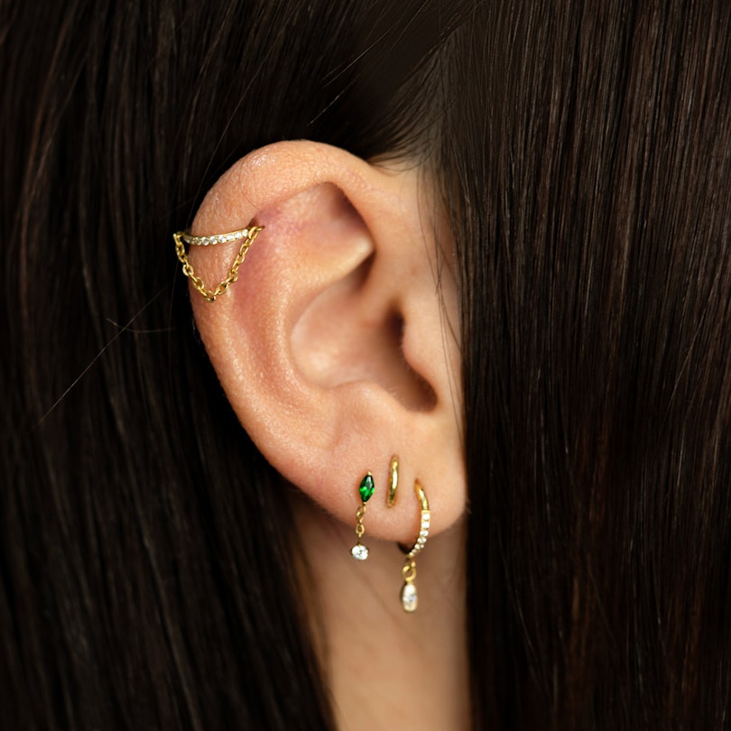 En titaniumlabret med smaragdfarvet sten og vedhæng, der ved, hvordan man holder tingene i gang. Den har en grøn sten af kubisk zirkonia på toppen og en klar sten hængende nederst, der lærer dit øre at flirte.