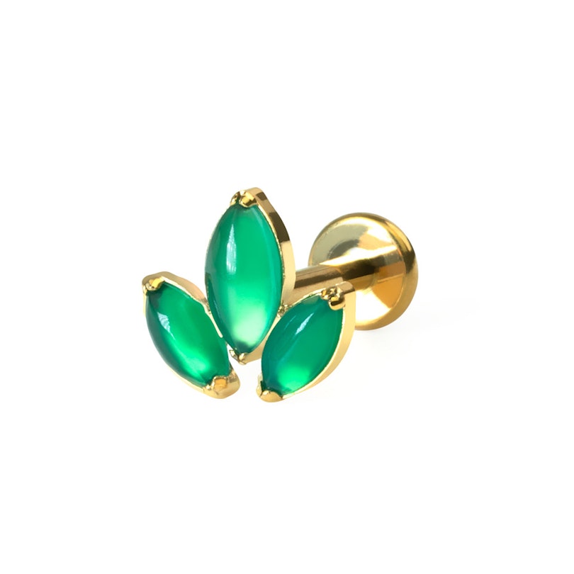 En stilfuld labret med 3 marquise-skårne, grønne sten arrangeret i et flot lotusblomst-design.