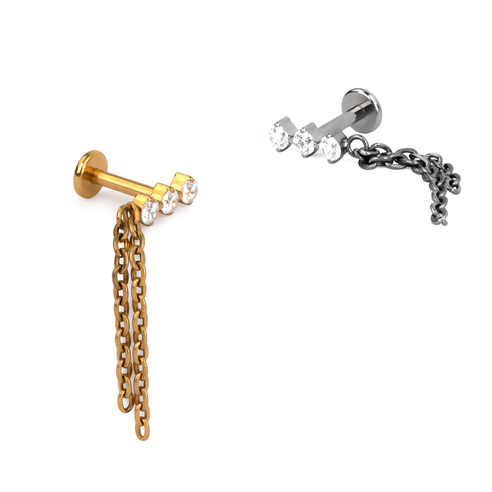 Stilfuld labret med en række af tre bezel-satte sten af zirconia og to kædevedhæng, der hænger fra en lille ring i enden. Kæderne har forskellige længder, hvilket giver en cool asymmetrisk effekt. Den længste kæde måler 19 mm. Smykket kan placeres vandret i øreflippen såvel som lodret eller på skrå i andre ørepiercinger - bær det på din måde for at skabe dit eget look.