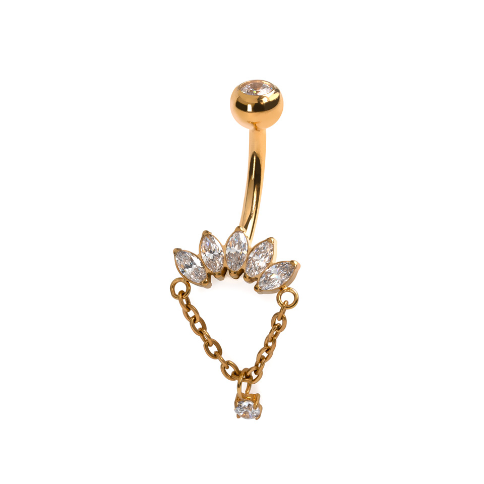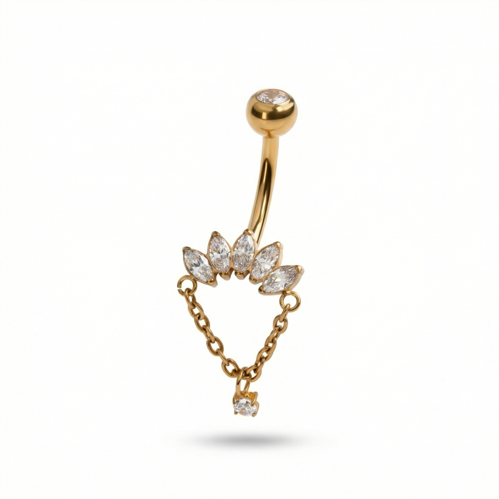 Denne titaniumnavlering med marquise-sten og kædevedhæng er ikke bare endnu en titaniumstav. Det er et smykke med personlighed. De marquise-skårne sten sidder som en lille krone, mens kædevedhænget giver akkurat den rette mængde drama (fordi din piercing fortjener lidt rampelys).
