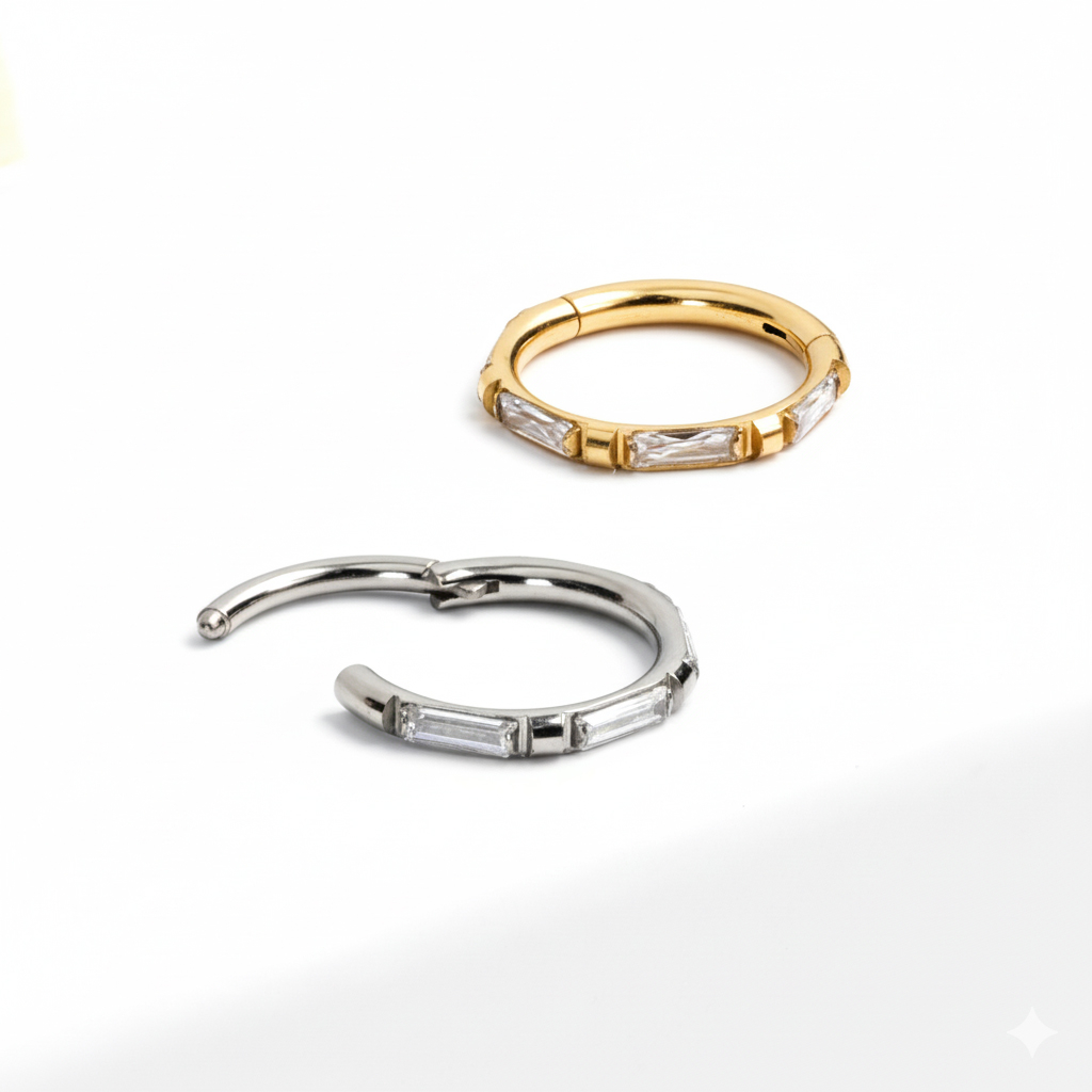 Denne titaniumring med baguette-skårne sten har et stilfuldt design med skiftevist baguette-skårne, rektangulære sten af kubisk zirkonia og små kvadrater af metal på ringens yderside. Da ringen er hængslet, er det let at sætte den sikkert i din piercing. Smykket er lavet af titanium, som gør det allergivenligt, holdbart og vandfast.