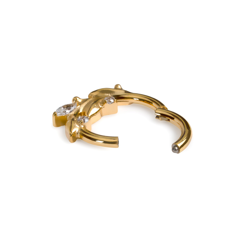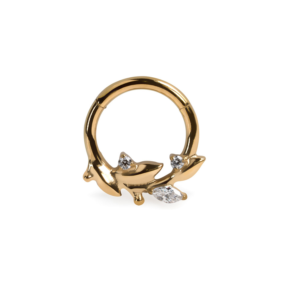 Denne smukke ring med fine blade er lavet af titanium, hvilket betyder, at den er velegnet til følsom hud. Den hængslede lukkemekanisme gør den let at sætte sikkert i din piercing.