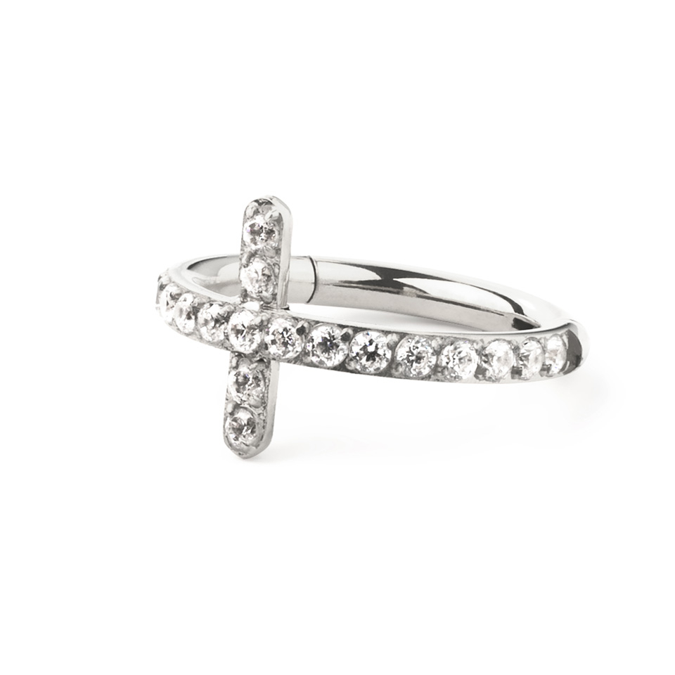 Forsiden af denne stilfulde titaniumring danner et kryds dekoreret med små sten. Takket være et hængsel er smykket let at sætte i din piercing. Titanium er allergivenligt og superholdbart, så dit smykke ikke mister sin glans. Fås i farverne guld eller sølv og med diameter 8 mm eller 10 mm. Et alsidigt smykke, der kan bæres i mange forskellige piercinger, inkl. øreflippen, helix og tragus.