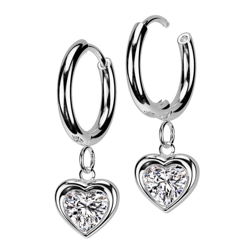 To ringe med hjertevedhæng giver et legende pift til dit hverdagslook. Hver ring har et lille hjertevedhæng, der dingler, når du bevæger dig. Med hængselslukningen er de nemme at sætte i og tage ud, så de er oplagte til de dagsplaner, der bliver til natplaner. Fås i guld- og sølvfarve.