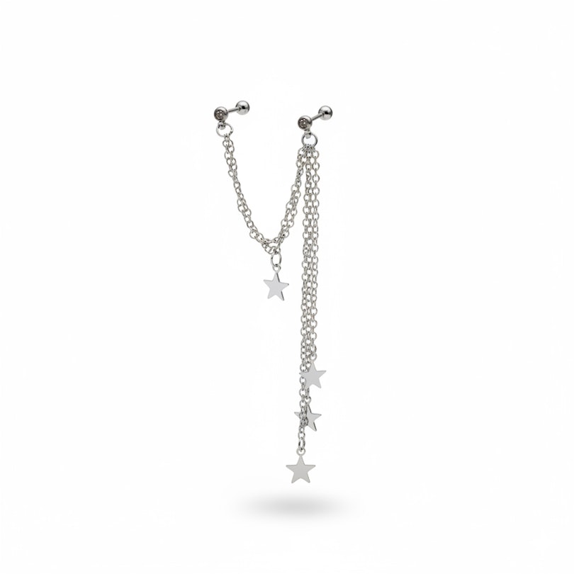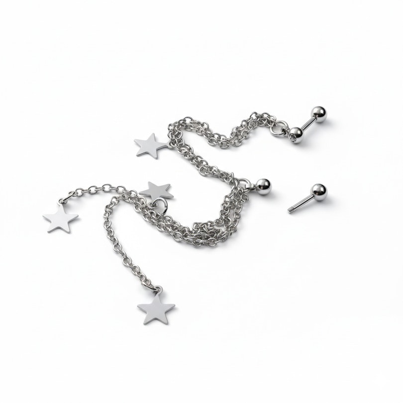 Smykket består af to små stave på 6 mm., som på fronten har en lille klar sten i den 4 mm. lille kugle. De to stave hænger sammen, ved hjælp af to kæder, som vil følge øret flot, når stavene er sat i hullerne.
