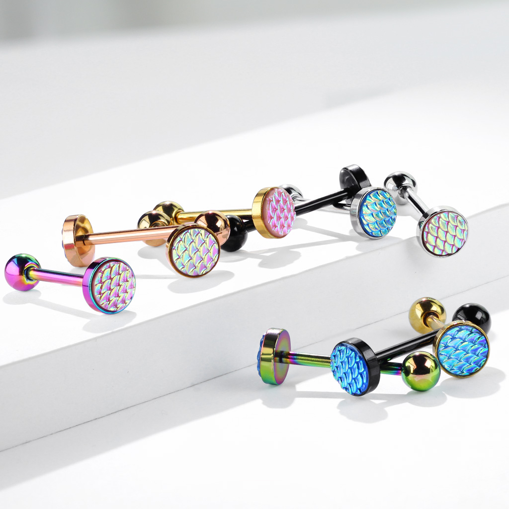 På billedet længere oppe på siden ser du en lidt speciel tungepiercing. Denne tungepiercing har nemlig et nuanceskiftende skældesign i topkuglen. Dette skældesign er lavet af resin og kan skifte mellem forskellige nuancer af den hovedfarve som du vælger til smykket. Det vil sige at, hvis du f.eks. vælger pink, så vil smykket skifte mellem forskellige nuancer af pink alt efter, hvordan lyset rammer smykket. Du kan også vælge mellem flere forskellige farver på staven, derved kan du skabe lige den farvekombination af stavfarve og farve på skældesignet, som passer bedst til dig - hver farvekombination giver smykket et nyt og friskt look.