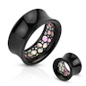 Det er netop det indvendige mønster som gør denne tunnel så unik og anderledes i forfold til så mange andre. Mønsteret forestiller små stykker af muslingskaller, som er trykket ned i det sorte akryl, på indersiden af smykket. De smukke skaller rangerer i mange forskellige farver, alt afhængig af hvordan lyset lige falder på dem.